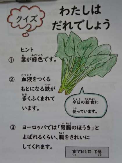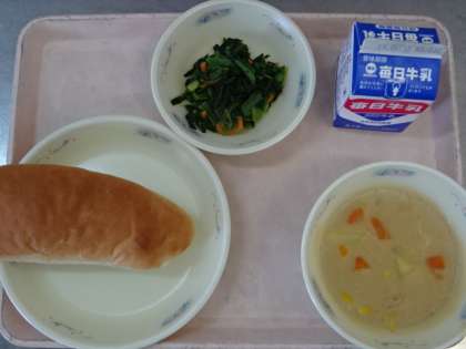 今日の献立は、「コッペパン(国内産小麦100%)・牛乳・コーンのクリームシチュー・ほうれん草のソテー」でした。シチューは野菜も鶏肉もやわらかくて、とても美味しかったです。今日も美味しい給食、ごちそうさまでした!