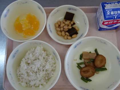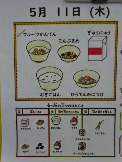 今日の献立は、「麦ごはん・牛乳・平天の煮つけ・こんぶ豆・フルーツ寒天」でした。フルーツ寒天は、食べる頃にはプルプルにかたまり、フルーツの甘みも合わさって美味しく、子どもたちにとっても最後の楽しみになっています。今日も美味しい給食、ごちそうさまでした!