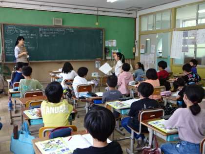 社会の学習の様子です。京都府の地形について調べています。4年生になり、自分たちの生活しているところから離れた場所についても、どんな特徴があるのか、これから学習していきます。