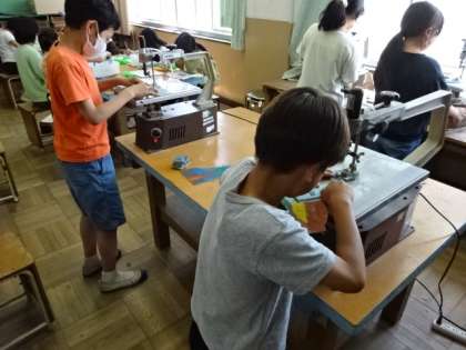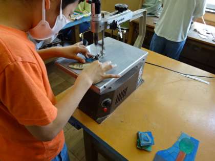 電動のこぎりを使って、作品作りをしています。安全に気をつけて、慎重に作業を進めています。