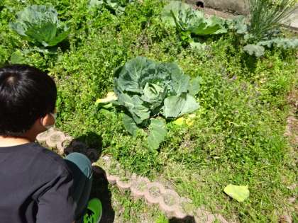 モンシロチョウのたまごやあおむしを見つけるために、花壇まで出てきての学習です。たまごからかえった小さなあおむしを見つけることができました。アオムシの成長がこれからどうなるのか、継続して観察していきます。