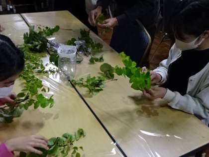 京都三大祭の一つ「葵祭」が、毎年5月15日にあり、今年は4年ぶりに行列も行われます。その際に使用する葵桂の奉製作業のお手伝いを、葵祭の前日に本校の子どもたちもさせていただきました。