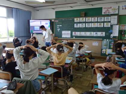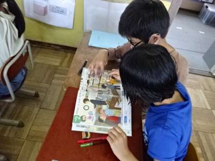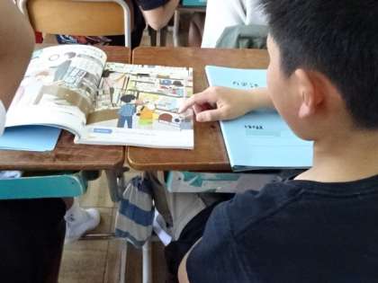 5年生の外国語の学習の時間の様子です。友だちとペアで、ポインティングゲームをしています。相手より先に英語を聴き取ろうと集中しています。真剣な表情をしながらも、ゲームを楽しんでいます。