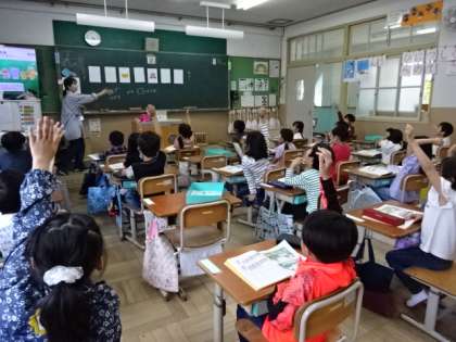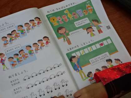 「なんばんめ」の学習です。「右から」「前から」などの前後、上下、左右の言葉と数を用いた位置の表し方を考えます。難しい内容ですが、クイズ形式を取り入れながら楽しく学習しています。