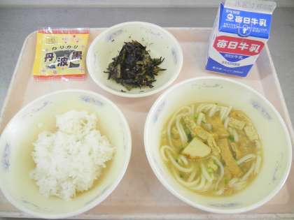 減量ごはん・牛乳・きつねカレーうどん・小松菜とひじきのいためもの・黒大豆 です。
