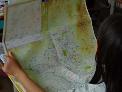 京都市の学習をしています。上賀茂地域から離れた場所についても、地図を広げて、東西南北を意識しながら調べたり見つけたりしています。