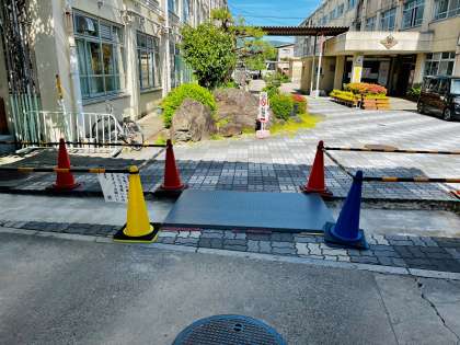 本日より車の出入りが可能とお伝えしていましたが、工事業者が設置した鉄板の幅が狭いため、引き続きご不便をおかけしますが、南門をご利用いただきますようお願いします。歩行者や自転車は通っていただけます。ご不便をおかけしますが、ご理解ご協力をよろしくお願いします。