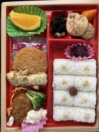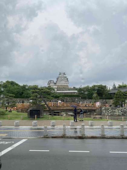 姫路城が見えました。あいにくの雨なので、バスの中でいただきます。食事係の挨拶があり、みんなで楽しくいただきました。