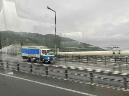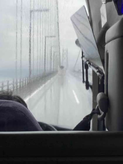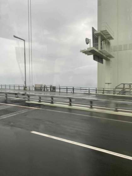 雨の中、バスは明石海峡大橋を渡り、淡路島に入りました。明日、お土産の買い物で立ち寄る予定のサービスエリアの観覧車に気づいている子もいます。