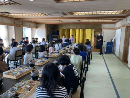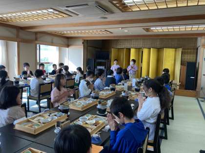 食事係の挨拶で、朝食を美味しくいただいています。先生たちもしっかり食べて、今日の活動に備えます。