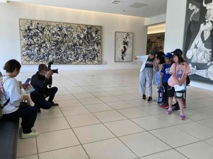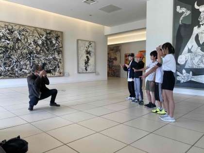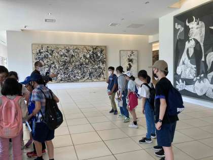 ピカソのゲルニカの前で、グループごとに記念写真を撮影です。たくさん歩いて、少し疲れた顔も見えますが、グループでしっかりと行動しています。