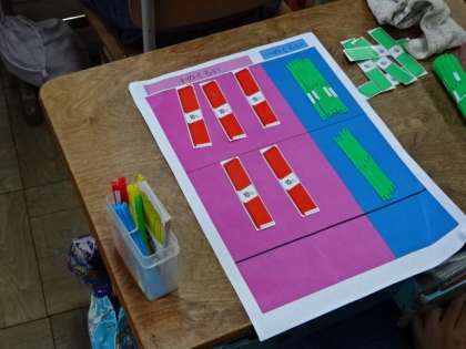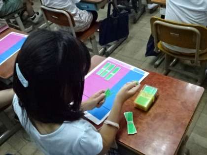 算数の学習では、筆算の計算の仕組みについて、数え棒を使いながら数学的活動を通して、理解を確かなものしています。