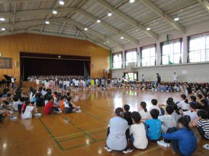 全校児童が体育館に集まり、各学年から1年生にお迎えの気持ちを込めて出し物や上賀茂クイズを披露され、迫力あるとても充実した時間になりましたね。