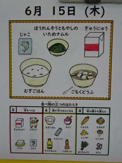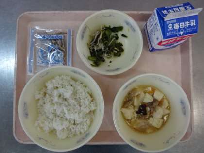 今日の献立は、「麦ごはん・牛乳・五目どうふ・ほうれん草ともやしのいためナムル」でした。具だくさんの五目どうふに、絶妙な味付けのナムル、食欲もすすみます。今日も美味しい給食、ごちそうさまでした!