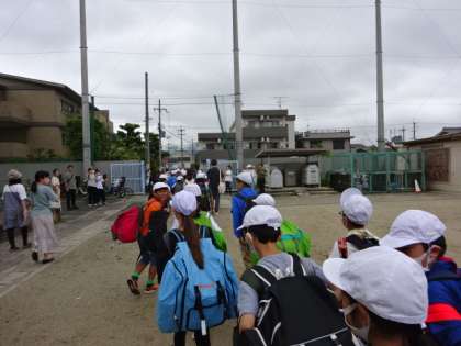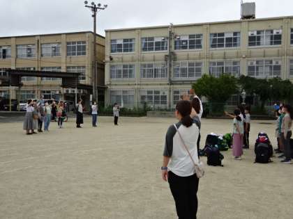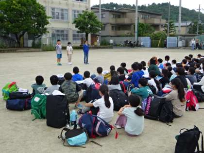 5年生は、今日から、2泊3日の花背山の家での宿泊学習に入ります。出発式では、この3日間の目標をみんなで確認しました。たくさんのお家の方々に見守られて、元気に出発です。