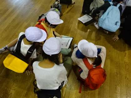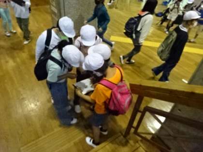 館内ラリーでは、グループで協力して問題を解いていきます。また,ラリーを通して、山の家の施設内を確認しています。