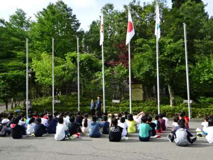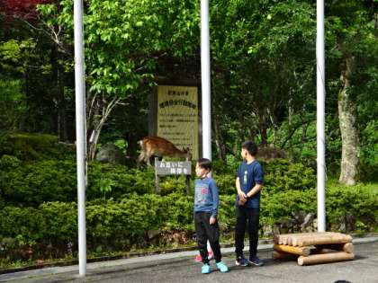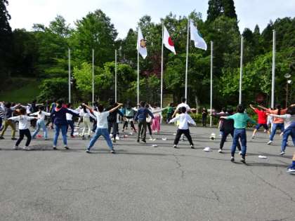 天気がいいので、外で朝の集いです。新喜劇バージョンのラジオ体操で、しっかりと体を起こします。鹿も近くまでやって来て、二日目の活動の始まりを見守ってくれています。