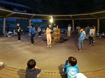 キャンプファイヤーがいよいよ始まります。まだ夕暮れ時ですが、レクリエーション係の子たちが、緊張の面持ちで会をスタートさせました。