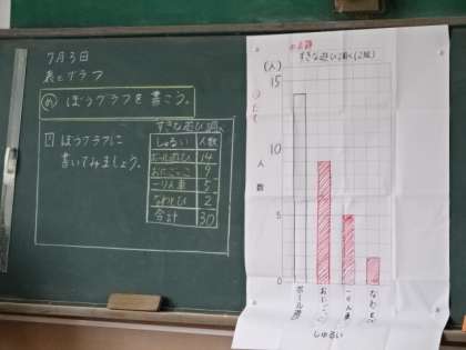 算数は「表とグラフ」の学習です。資料から読み取ったことを、棒グラフに表すことを今日は学習しました。
