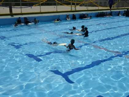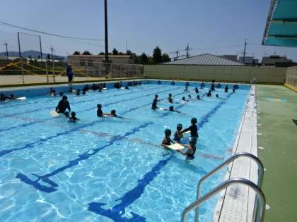 1年生の水あそびの様子です。夏を感じる暑さのもと、浮かんだりもぐったりして、友だちと水あそびを楽しんでいます。