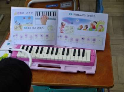 鍵盤ハーモニカでの演奏を学習し始めています。指の動かし方、息の吹き方など、一つ一つ学習をしています。上手に演奏できるように、これからも繰り返し練習していきます。