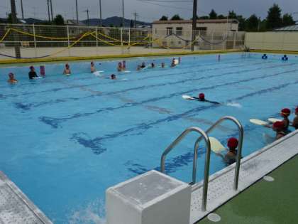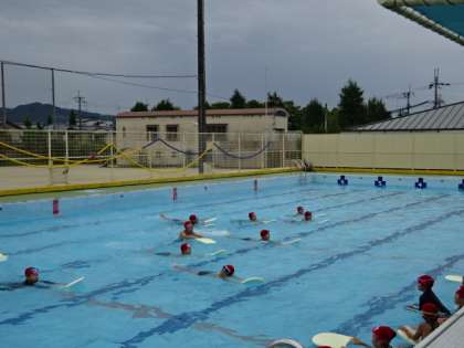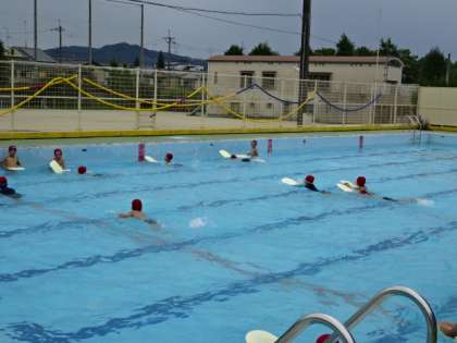 水あそびを楽しんでいます。たっぷり水に慣れ親しんだ後は、ビート板を使って、バタ足で泳ぐ練習もしました。