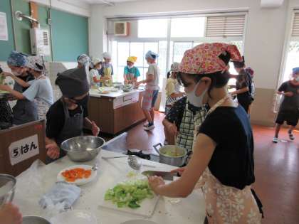 花背山の家で野外炊事を経験した5年生は、今日の調理実習を楽しみにしていました。 野菜を使ったゆで野菜サラダを作っています。家庭科室はドレッシングのおいしいそうな香りが漂っています。調理では、声を掛け合いながらてきぱきと調理を進めていました。さすがです!