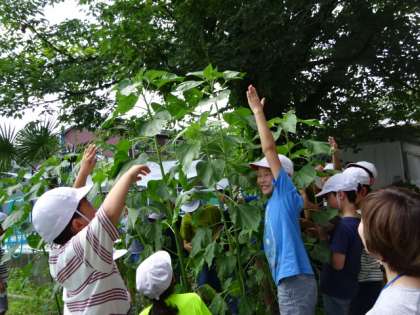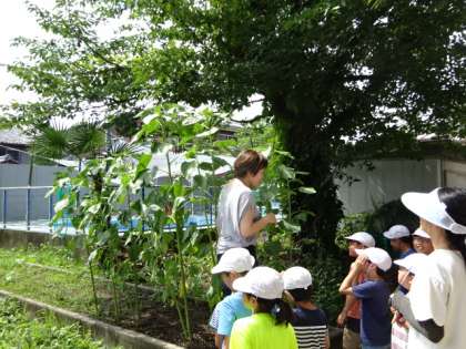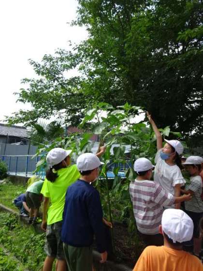 植物の観察で学校園に出てきた3年生。ヒマワリがぐんっと大きく成長していることに、みんな驚きです。思わず背比べをして、成長を実感していました。