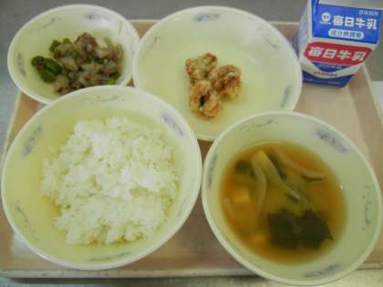 ごはん・牛乳・はものこはくあげ・伏見とうがらしのおかか煮・みそ汁 です。