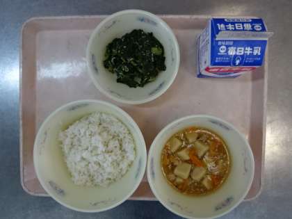 今日の献立は、「麦ごはん・牛乳・高野どうふのそぼろ煮・ほうれん草とじゃこのいためもの」でした。高野どうふに餡がしみ込んでいて、ひき肉との相性も抜群でした。今日も美味しい給食、ごちそうさまでした!