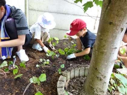 まずは、草刈りからはじめましたが、みんなの手できれいに草を刈ることができ、プランターで育てていたフタバアオイを植えかえました。昨年度末に植えかえたフタバアオイも大きな葉を広げていて、少しずつ自生が広がれば嬉しいです。