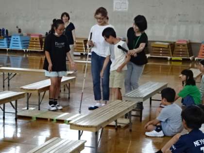 お話を聞いた後に、実際にどのようにサポートしていけばいいのか、体験をしました。バス停までの案内や、バスが来た時の伝え方について、実践を通して考えていきました。