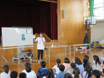 学校歯科医の先生と歯科衛生士の先生に来ていただき、2年生と5年生が歯みがき指導を受けました。学校歯科医の先生より、規則正しい生活と栄養のある食事をとり、しっかりと噛むことの大切さを教えてくださいました。そして、歯科衛生士の先生より、正しい歯のみがき方や歯と口の健康について指導がありました。先生方のお話が分かりやすかったので、2年生、5年生とも真剣に指導を受けていました。