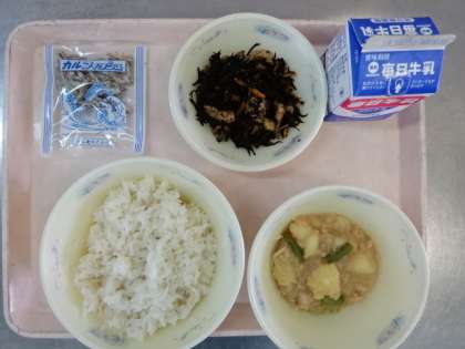 今日の献立は、「麦ごはん・牛乳・じゃがいものそぼろ煮・ひじきの煮つけ・じゃこ」でした。じゃがいものそぼろ煮は、ホクホクしたじゃがいもにあんが絡み、ごはんにもよく合います。今日も美味しい給食、ごちそうさまでした!