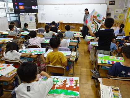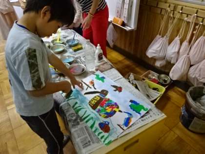 お話の絵に取り組んでいる2年生。各クラスごと、取り組んでいるお話は違いますが、丁寧に絵の完成を目指しています。