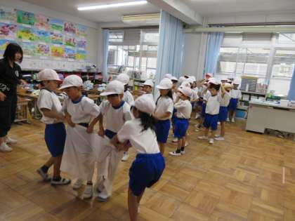 体育の授業の後、教室でデカパン競争の練習を行っていました。デカパンパンツを脱いで、お友達に渡すということを、いかにスムーズにできるようになるか。焦りながらも息を合わせて思いやりの気持ちをもって、一生懸命に頑張っていました。
