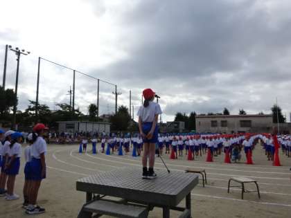 計画委員会のメンバーによる司会進行で開会式です。6年生の各色のリーダーも、決意を堂々と述べてくれました。全校体操も、みんなでリズムに乗りながら元気よく体操しました。