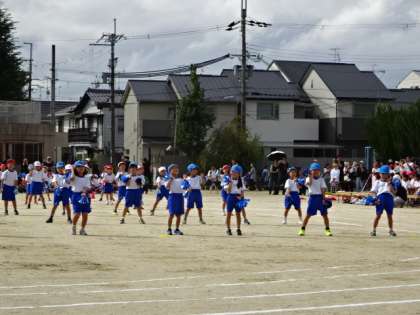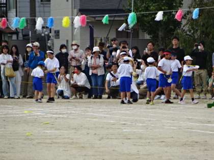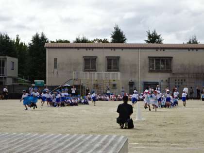 1年生にとっては、初めてのことで緊張する様子もありましたが、みんなで力を合わせて頑張りました。50m走でゴールした時には、6年生からメダルをかけてもらいました。