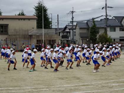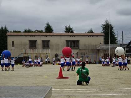 「ハカ」のかけ声で心を一つにした4年生。チームで心を一つにして、大玉を仲間につないでいきました。