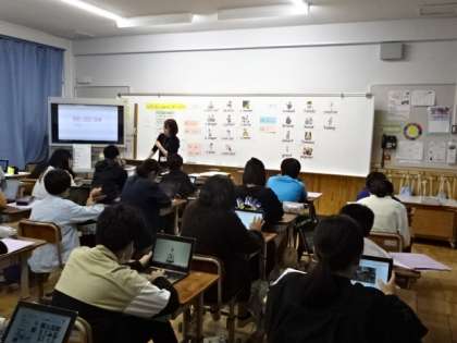 専科の先生と一緒に学習です。英語のインタビューを視聴し、聞き取れた英語から、何を伝えたかったのか考えています。これまでの学習を思い出しながら、学習にのぞんでいます。