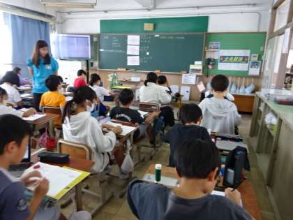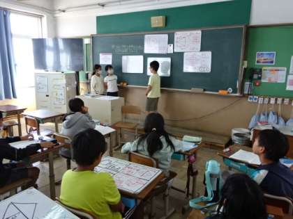 面積を求める学習です。お互いの考えをスムーズに交流できるように、ホワイトボードを活用したり、GIGA端末を使ったりしています。