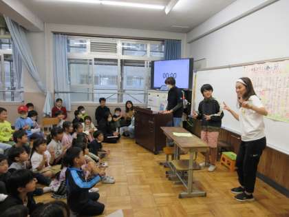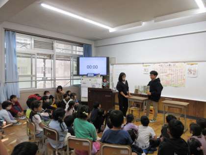 今月は4〜6年生の本クラブのお兄さん、お姉さんが読み聞かせをしてくれました。お話の前に手遊びなどがあり、教室内は楽しさで盛り上がっていました。お兄さん、お姉さんが上手に読み聞かせをしていたので、1年生の子たちも真剣に聞いていました。