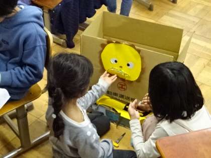 1年生に楽しんでもらうために、おもちゃ作りをしています。自分たちが1年生の時に楽しませてもらったことを思い出しながら、一生懸命に取り組んでいます。2年生の1年生を思う姿、ほのぼのとさせられます。