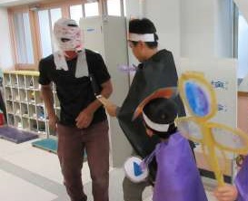 1組の子どもたちが、流れる音楽とともに保健室のドアをノックしてきました。ドアを開けると、ハロウィン仮装に身に包んだ子どもたちが、「トリック オア トリート」と言ってきました。イベントに盛り上がっていました。