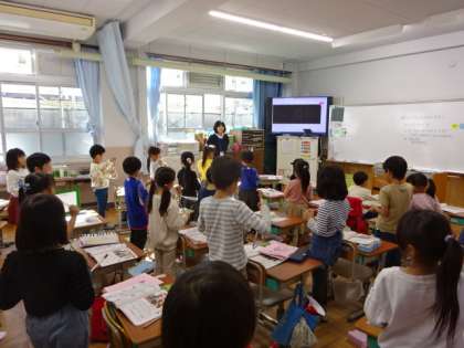 曲に合わせてリズム打ちを楽しんでいます。みんなで順番にいろいろな楽器を手にして、それぞれの楽器の音色も楽しんでいます。