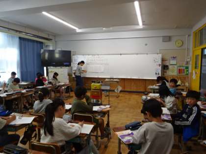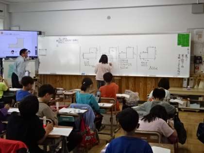 面積の学習をしています。長方形の面積の求め方を使って、いろいろな形の面積を工夫して求めていきます。
