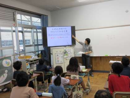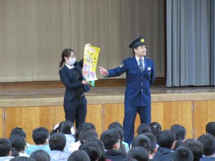 防犯訓練の前に「いかのおすし」を確認しました。子どもたちは、放送の話や先生の話をよく聞き、真剣に取り組んでいました。安全が確認された後、体育館に避難して、校長先生から訓練の必要性を分かりやすく伝えてもらいました。