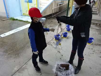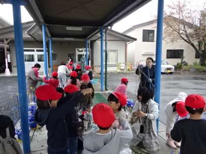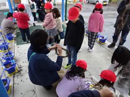 アサガオのつるでクリスマスリースを作る1年生。子どもたちだけで取り組むには大変だからと、お家の方々も応援に駆けつけてくれました。おかげで様で、無事リースの形に束ねることができました。これからの学習で、クリスマスの飾り付けをしていきます。素敵なクリスマスリースができることと思います。