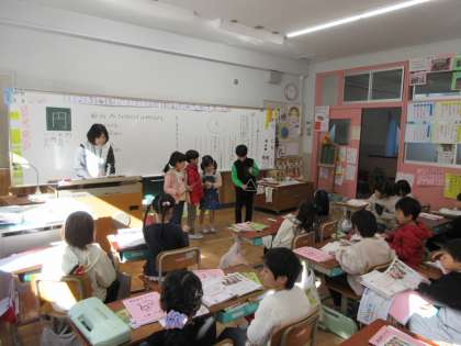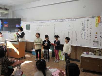 1年生は、カスタネット、鈴、タンバリンやトライアルグルのお気に入りの楽器で、楽しく演奏をしていました。子どもたちは、とても上手です。すごいです。とても楽しい学習ですね。お友達の演奏を聴いたり、歌ったりして思いっ切り楽しんでいる様子でした。