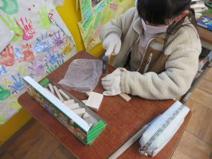 のこぎりと金づちを使って、作品づくりに取り組んでいました。友だちと助け合いながら道具を安全に使って学習を進めている姿が、とても素敵だなと感じました。